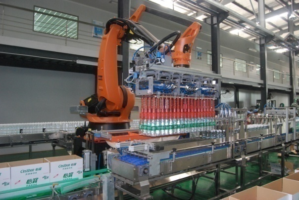 Case LoadingWorking principle: the conveyor belt will transport the product to the grouping mechanism, the grouping mechanism will divide the product into 3X6 or 3X4 arrangement according to the requirements, after the grouping by the specially designed bottle pulling speed mechanism will open a certain distance between the grouped products; The product is then transported to the manual filling station through the conveyor line; After manually adding the paper card, the product is transported to the waiting station, squeezed to ensure the pressure between the paper card and the bottle, and then enters the waiting station; The robot moves the fixture to absorb the product, and at the same time, the paper card is carried into the carton to complete a layer of packing action; 3X4 specifications only absorb once; 3X6 specification After loading the first layer, the robot rotates on the side to absorb the intermediate paper partition into the carton, and then absorb the product into the carton to complete the 3X6 specification packing. |