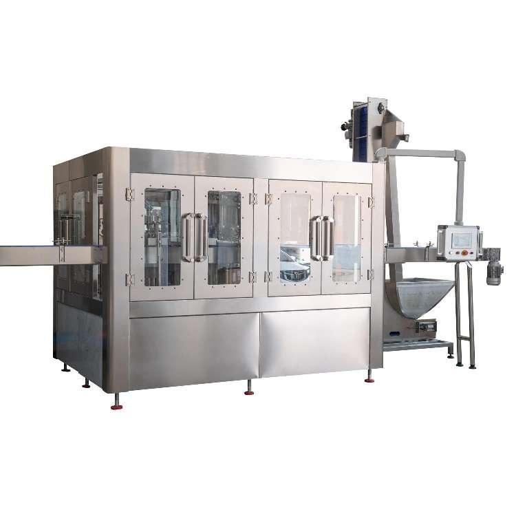 Bottled Water Filling LineBottled Water Production Line is designed for filling mineral water, purified water or other non-carbonated liquid into PET bottle. Applied Containers: PET bottles with various capacities and shapes. Application: Mineral water and other bottled water etc. Filling System: Mechanical Valve or Flow-Meter Valve. Capacity: 5,000-48,000BPH. Product’s scope: Blowing molding system, air compressor system, filling system , purification system, caps sterilization system, sterile air system, filled bottle conveying system, labelling machine, carton/film packing machine, palletizer, electric control, engineering design and construction. Rinser-Filler-Capper Monobloc is an efficient automatic liquid packing machine that perfectly combines bottle rinsing machine, pressure filling machine and capping machine. Empty bottles are orderly fed into the rinsing machine by an air conveyor, and then are turned over and washed inside by the nozzles. After dripping, bottles are automatically sent to the filling machine for high quality and high speed filling. At last, the capper is used for safe and reliable capping of these bottles. Features1、All parts in contact with liquid and material are made of superior stainless steel to meet the requirement of food hygiene. 2、Adopting Mechanical valve or flow-meter valve filling, the filling machine can accurately fill at high speed while maintaining high filling quality. 3、Bottles are fed by the air conveyor, conveyed by clipping the bottle neck, and put out via the conveyor chain, thus making it easy and convenient to change bottle size. 4、Our bottled water production line is controlled by frequency conversion motor+PLC+man-machine interface. So production speed, shift production and failure alarm etc. are displayed on the screen for simple operation. 5、The machine is equipped with stainless steel shield and safeguard door (made of organic glass, with safety electrical switch). The machine will automatically stop when the door is opened. |